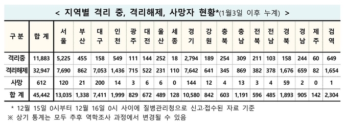 12월16일 0시기준으로 격리 해제된 확진 환자는 전날 388명이 늘어 총 3만2천947명이고, 격리 상태에서 치료 중인 확진 환자는 1만1천883명이다. 또한, 코로나19 진단검사를 받은 사람은 총 348만8천769명이며, 이 중 348만8천543명이 '음성'으로 확인됐고, 9만4천784명은 검사 중이다.