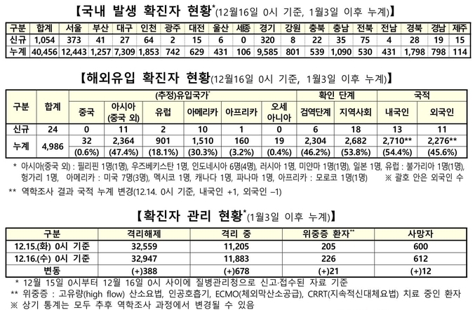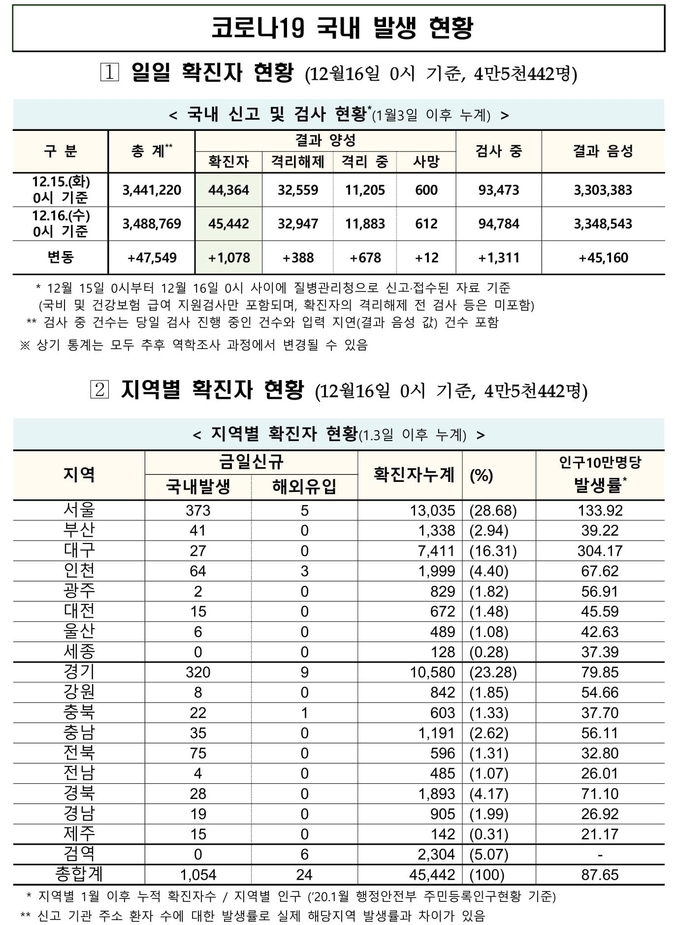 질병관리청 중앙방역대책본부(중대본)는 12월16일 0시 기준으로 국내 발생 신규 확진 환자는 1천54명 확인되었고, 해외유입 사례는 24명 확인되어 총 1천78명 신규 확진 환자가 발생되어 지금까지 총 누적 확진 환자 수는 4만5천442명이라고 밝혔다.