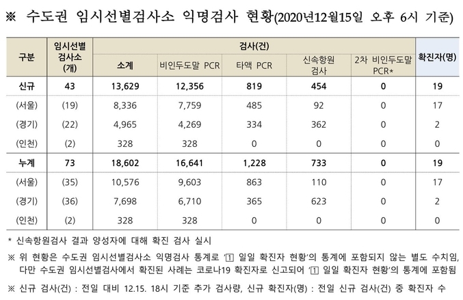 여기에다 지난 14일부터 수도권 임시 선별검사소(150곳 설치 예정. 15일 오후 6시 기준 73개 설치·운영 중)에서 시행된 1만3천629건의 선제 검사 건수까지 더하면 실제 검사 건수는 더 늘어난다. (다만 수도권 임시 선별검사소에서 확진 된 사례는 코로나19 확진 환자로 신고되어 일일 확진 환자 현황에 포함됨)