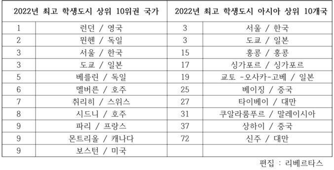 아래의 지표는 ‘2022년 최고 학생도시 순위 상위 10위권’ 국가와, ‘아시아 순위 상위 10개국’ 국가들이다.