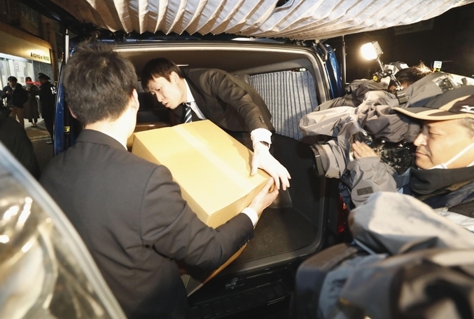 (도쿄 교도=연합뉴스) 2019년 12월 19일 도쿄지검 특수부 수사관 등이 도쿄도 고토(江東)구에 있는 아키모토 쓰카사(秋元司) 중의원 의원의 지역구 사무실을 압수수색한 뒤 압수물을 차에 싣고 있다." width="490" xtype="photo">