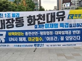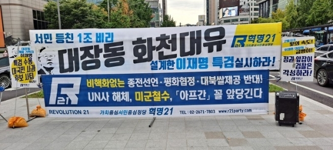 1인 시위 참가자와 이에 호응하는 일반시민들과의 거리두기를 위해 애쓰는 경찰들을 위로(?)하며, 가방속에서 꺼내든 손피켓에는 ‘대장동의 설계자, 이재명 특검하라!’는 구호가 적혀 있었다.
