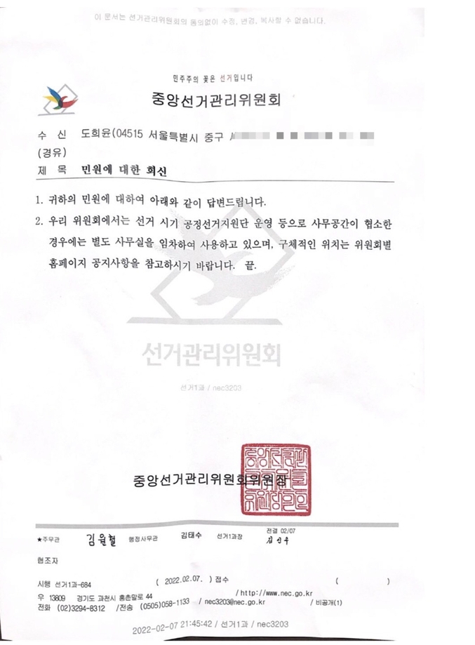 본지가 지난 1월 28일 중앙선관위 노정희 위원장 앞으로 보낸 ‘3.9대선 관련 임시사무소 설치’에 대한 질의서에 중앙선거관리위원회가 답변을 보내왔다.