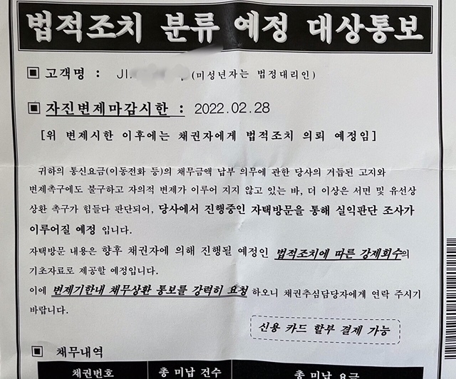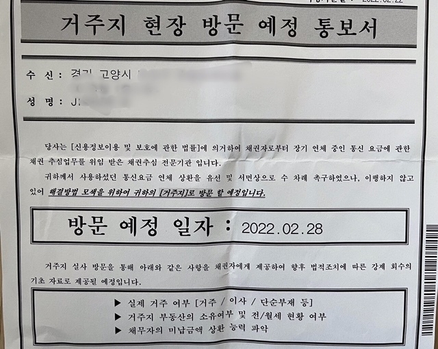 경기도에 사는 A씨는 본지에 자신이 받은 금융권 통지서를 보여주며 “이사온지 얼마되지 않았는데 계속 이런 통지문이 와서 이사 간 사람의 것으로 생각해 보지도 않고 버렸다. 그런데 이번에는 신용정보회사에서 보낸 것이어서 개봉을 했더니, 거주지 방문 등 법적조치 예정 통보문이 들어있어 그 회사에 연락을 했다”는 것이다.