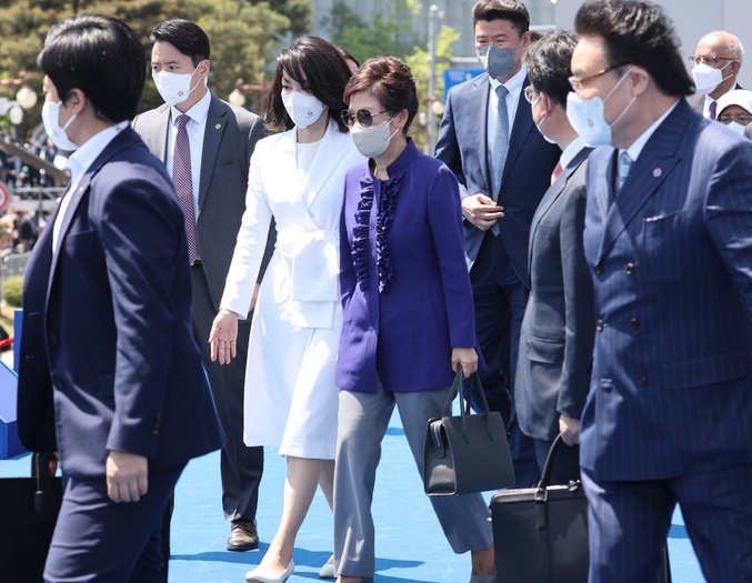 국회 정문 앞에 도착하여 의전차량에서 내린 윤대통령 내외는 일찍부터 국회 광장을 가득메운 시민들과 일일이 손을 마주치며, 국회 본관 앞에 마련된 연단을 향해 걸어서 이동했다. 취임식장에는 국내외 귀빈 및 국회와 정부 관계자, 각계 대표, 초청받은 일반국민 등 4만1천명이 참석했다.