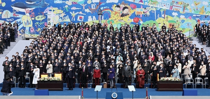 통합이나 소통은 단 한 차례도 언급하지 않았지만, 윤 대통령은 취임사 말미에 대한민국이 세계 10위권 경제 대국의 위상을 지니게 됐다며 "글로벌 리더 국가로서의 자세를 가져야 한다"고 제안하면서 "우리나라뿐 아니라 세계 시민 모두의 자유와 인권을 지키고 확대하는데 더욱 주도적인 역할을 해야 한다"고 강조했다.