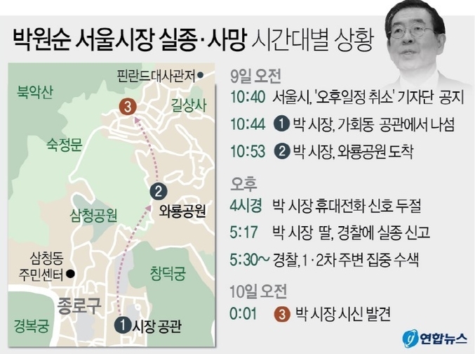 박 전(前) 시장이 숨지기 전날 청와대로부터 '강제추행에 대해 고소를 당했다'는 내용의 전화를 받았다는 것이다. 정 변호사의 말이 사실이라면 수사 정보가 청와대를 통해 피의자에게 유출된 것이어서 큰 파장이 예상된다.