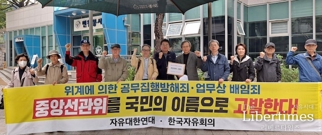 자유대한연대와 한국자유회의가 중앙선거관리위원회를 ‘위계에 의한 공무집행방해’와 ‘업무상 배임죄’로 19일 오전 서울경찰청에 정식 고발했다.