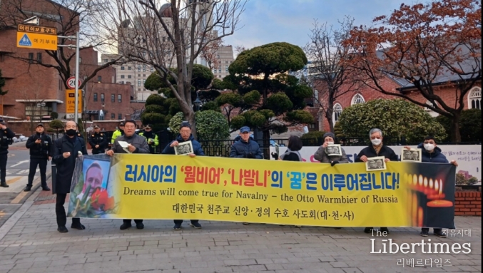 25일 저녁 서울시청 인근의 대한문 광장에서 ‘대한민국 천주교 신앙·정의 수호 사도회(이하 대천사)’소속 회원들이 모여, 러시아의 자유민주주의 투사인 알렉세이 나발니의 억울한 죽음을 애도하고 추모하는 ‘작은 기도회’를 가졌다.