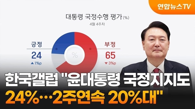 갤럽의 윤 대통령 지지율 여론조사를 보면, 지난 21∼23일 전국 만 18세 이상 1천1명을 대상으로 조사(95% 신뢰수준에 표본오차 ±3.1%포인트)한 결과에서 윤 대통령의 직무 수행 긍정 평가는 24%라고 발표했다.
