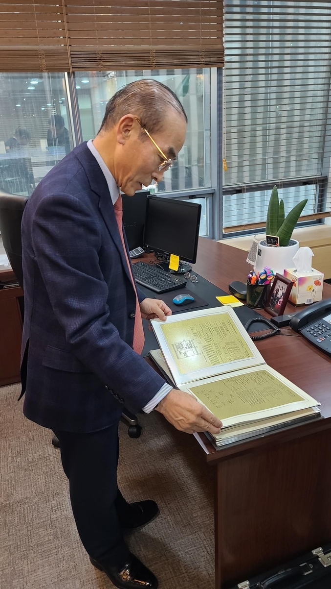 "삼성전자에서 받은 천경준 특허집" 을 살펴보고 있는 천회장