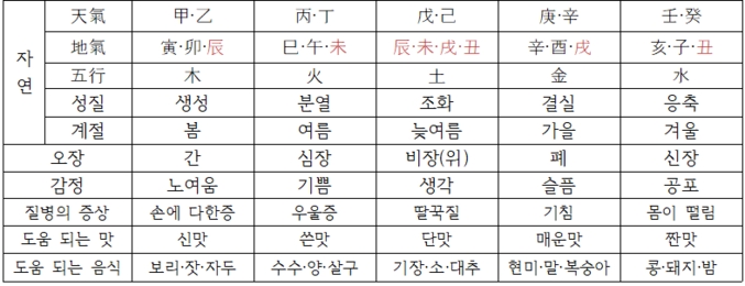 선조들은 자연의 섭리와 이치에 따라 인간과 만물은 태양에서 발산하는 빛과 열, 그리고 공기(空氣), 화기(火氣), 수기(水氣), 토기(土氣)의 조화(造化)로 인하여 태어나고, 자라고, 성하고, 쇠하고, 멸하는 순환을 반복한다고 보았다. 이런 기운과 더불어 순환과 변화를 함께 하는 다섯 가지 물질[물(水), 불(火), 나무(木), 쇠(金), 흙(土)]이 있다고 보았다.