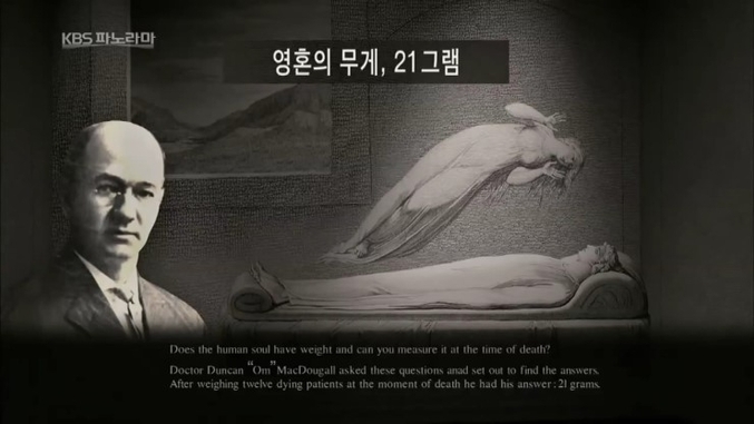 던컨 맥두걸 박사는 “영혼의 무게를 측정하기 위해서 결핵으로 죽어가는 환자를 커다란 저울 위에 올려놓고 무게 변화를 지켜보았는데, 결핵 환자의 숨이 딱 끊어지는 순간 저울의 무게가 약 21g가 줄어들었다”고 주장하였다.