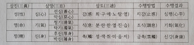 그 내용이 삼일신고(三一神誥) 제5장 인물 편에 “사람과 만물이 다 같이 삼진(三眞; 성품과 목숨과 정기)을 부여받았으니, 오직 사람만이 지상에 살면서 미혹되어 삼망(三妄; 마음과 기운과 몸)이 뿌리를 내리고, 이 삼망이 삼진과 서로 작용하여 삼도(三途;느낌과 호흡과 촉감)의 변화 작용을 짓게 된다”고 기록되어 있다.