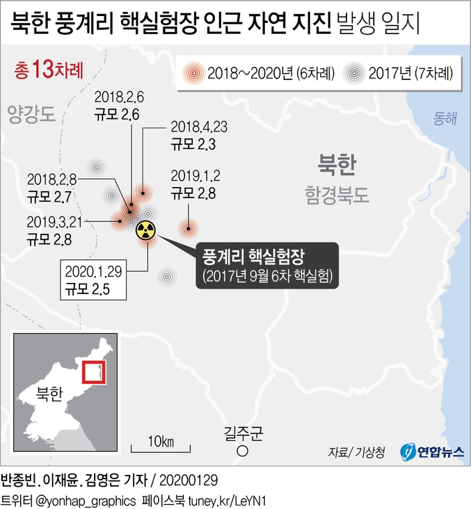 북한의 핵실험장이 있는 길주군 풍계리 일대에서는 2017년 9월 6차 핵실험 이후 지금까지 이곳에서 50회에 가까운 자연 지진이 발생한 것이다.