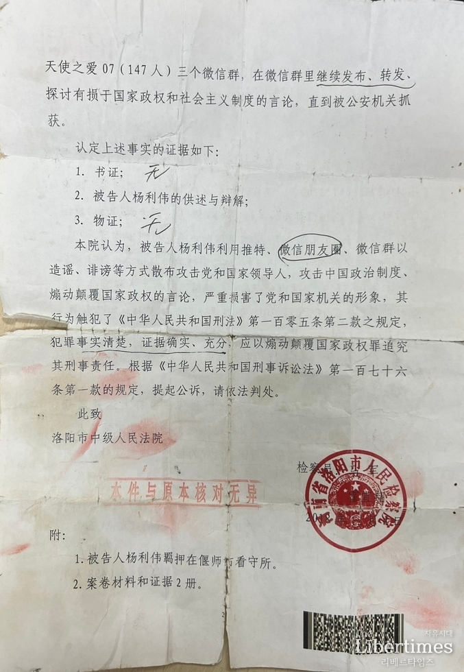 허난성 옌스청 관진에 살았던 양리웨이(楊利伟)는, 중국내 소셜미디어에 글을 올리거나 그것을 재전송한 혐의로 2018년 7월 중국 공산당 당국에 구속돼, 2020년 3월 '국가정권전복죄'로 징역 2년 6월을 선고받고 2021년 1월 23일 허난성 위시감옥에서 복역하다 풀려났었다.