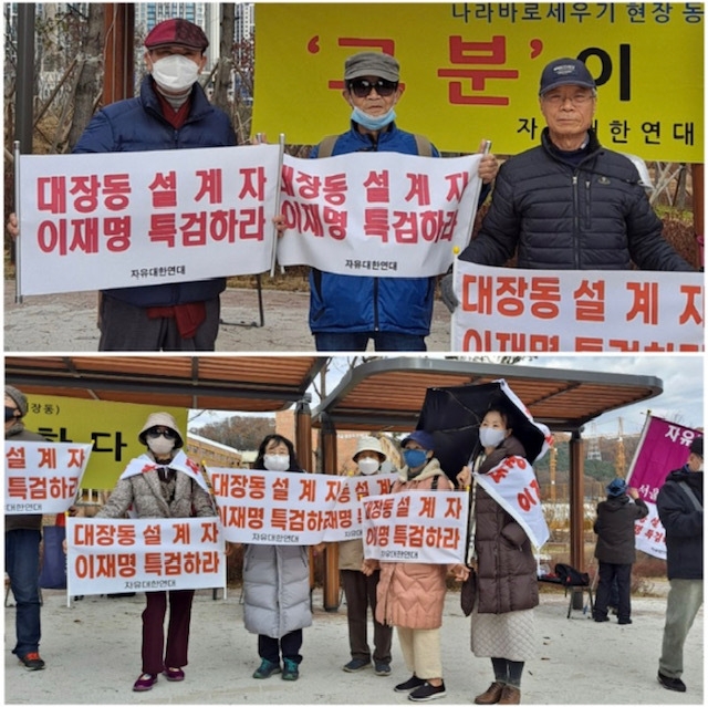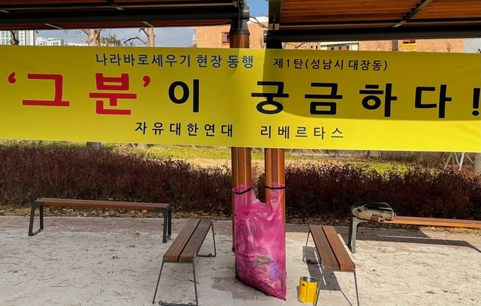 ‘대장동 설계자 이재명 특검하라!’ 등의 손 피켓을 들고, ‘그분이 궁금하다...’ 고 쓰여진 현수막 앞으로 모여든 자대연 회원들은 유독 종량제 쓰레기 봉투가 보이는 곳을 가르쳤다.