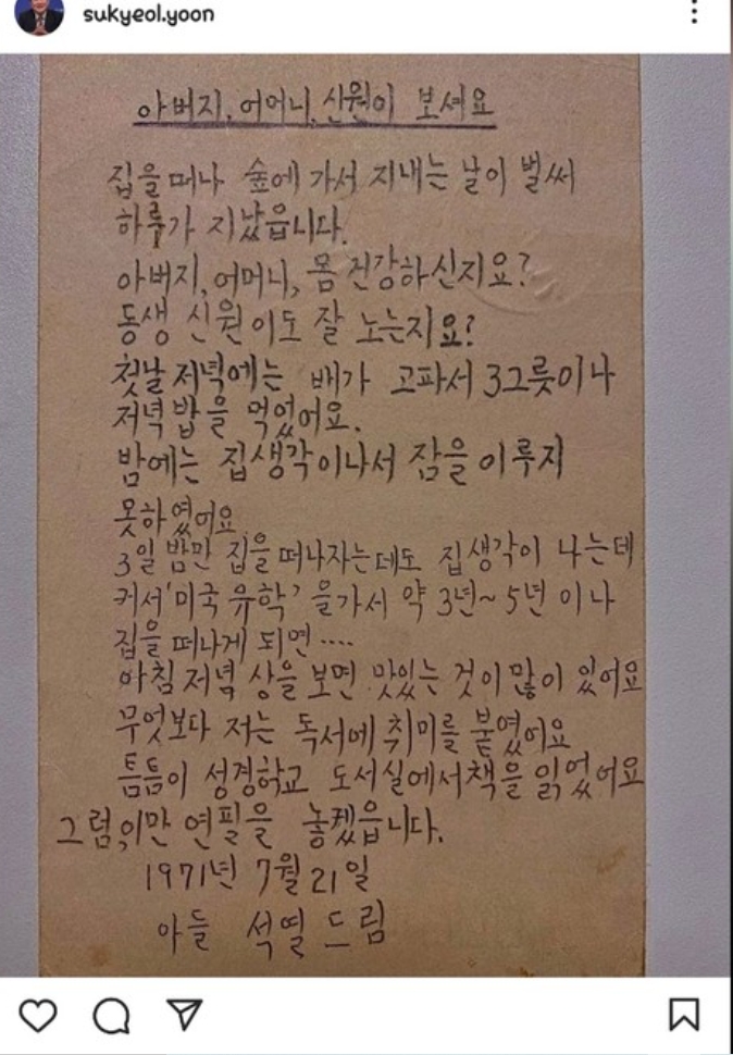 다음은 윤석열 후보가 11살의 나이에 교회 성경학교를 갔을 때 가족들에게 보낸 편지다.