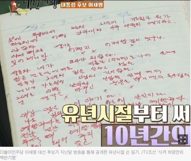 이후보가 작년 12월 TV조선 ‘식객 허영만의 백반기행’에서 직접 공개한 과거 일기장이었는데, 당시 이 후보는 “10년간 쓴 일기장으로 프러포즈해 부인 김혜경씨를 감동시켰다”고 말했다. 하지만 이런 감동스토리가 방송 된지 한달여만에 누군가 1980년 9월 이 후보가 붉은색 글씨로 쓴 일기장을 캡처해 게시물을 올리면서 논란을 촉발했다.