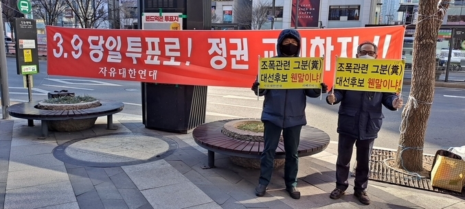‘법인카드 공금횡령, 나랏돈이 네 돈이냐’는 글씨가 선명하게 쓰여진 현수막 앞에서 다가오는 3·9 대선관련 어깨띠를 두른 시민단체 회원들이 모처럼 활기에 넘치는 거리에서 선거 캠페인을 펼치고 있었던 것이다.