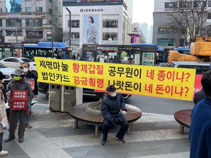 최근 불거져 나온 이슈로 집권여당의 대통령 후보로 나선 이재명 전 경기지사의 부인인 김혜경씨가 남편의 성남시와 경기도청 재직시 배우자의 신분으로 불법적인 법인카드를 사용한 이슈를 문제 삼고 있었다. 가뜩이나 힘겨운 나날을 보내고 있는 국민들을 분노케 한 시점에 이같은 현수막을 걸고 규탄 캠페인을 벌인 것으로 보여진다.