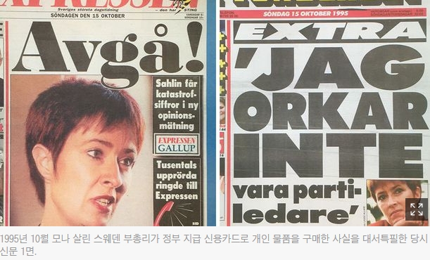 1996년 당시 38세였던 스웨덴 사민당 정부의 부총리 모나 살린(Sahlin)은 총리 계승을 눈앞에 두고 정부 법인카드 개인 사용이 드러났으며, 분노한 스웨덴 국민들에 의해 그녀는 낙마했다. 스웨덴 국민은 정치인이나 공직자가 세금으로 특권을 누리는 것을 결코 용납하지 않는다. 이런 스웨덴에서는 총리 외엔 관용차‧운전기사도 없으며, 국회의장이 지하철 좌석에 앉아 출근하고 시장이나 의원들이 버스 정류장에서 줄을 서는 것은 지극히 일상적인 일에 불과하다.