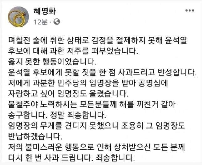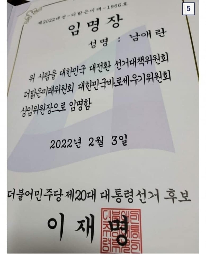 ‘남애란’으로 적혀있는 임명장 이름과 인터넷 커뮤니티에 올린 이름은 서로 다르지만, ‘저주의식’ 사진이 논란을 빗자 동일한 인터넷 커뮤니티에 사과하는 글을 ‘혜명화’라는 이름으로 올렸다. 내용 중 민주당의 임명장을 받았다고 밝힌 것으로 봐서는 임명장의 ‘남애란’과 동일인물인 것으로 보여진다.