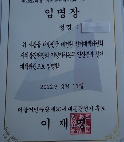 경기도 안산에 소재하는 탈북민연합회 안산지부는 최근 자신들의 회원들을 대상으로 이재명 후보 명의의 임명장을 마구 제작·배포하고 있다며, 이는 명백한 선거법 위반이자 민감한 탈북민들의 이름을 마구잡이로 허락없이 사용하는 반인권적 행태라고 비판했다.