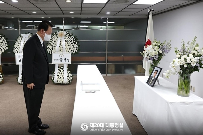 윤석열 대통령이 12일 아베 신조(安倍晋三) 전 일본 총리 국내 분향소가 마련된 서울 종로구 소재 주한일본대사관 공보문화원을 전격 방문하여 조문하였다.
