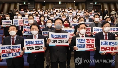 국민의힘은 이날 본회의에 앞서 의원총회를 열고 이 장관 해임건의안 추진에 크게 반발했다. 주호영 원내대표는 “예산통과 이후에 국정조사를 하고 그 결과에 따라 책임을 묻자고 했으나 이렇게 협치를 파괴하고 파행을 유도하고 있다”며 “결국 정쟁화를 일삼아 또 정부·여당의 발목을 잡아 대선을 불복하고 이렇게 함으로써 방탄 국회를 만들어 당 대표 수사나 비리를 덮어가는 책력으로밖에 보이지 않는다”고 비판했다.