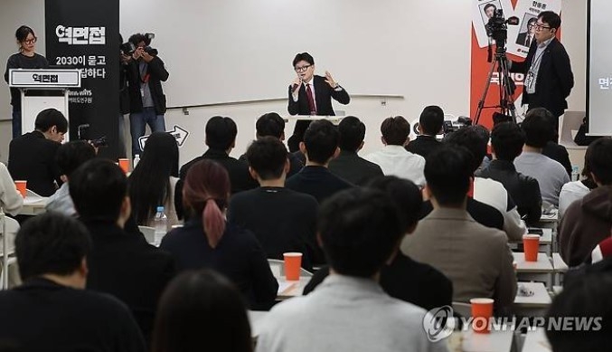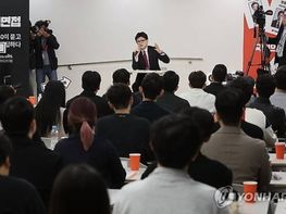 한동훈 국민의힘 대표가 27일 서울 성동구의 공유오피스에서 열린 '역면접X국민의힘' 행사에서 100여 명의 청년들과 대화하며 민주당의 이재명 대표 사법 리스크에 대한 비판을 쏟아냈다.