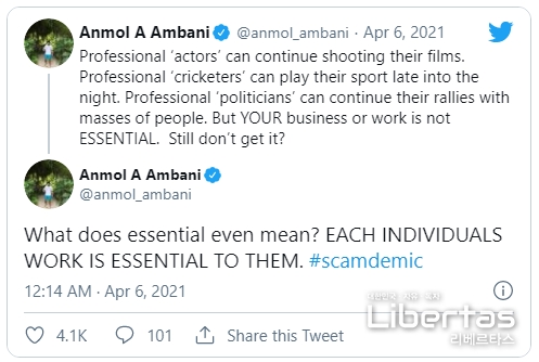 저명한 인도 산업공학자 아닐 암바니의 아들이자 전직 리라이언스 캐피탈사(Reliance Capital)의 임원을 지낸 암몰 암바니는 최근 자신의 트윗을 통해, 중소기업과 일용직 근로자들에게 피해를 주는 단속 규정을 맹비난했다. 일련의 트윗에서 그는 다음과 같이 주장했다.