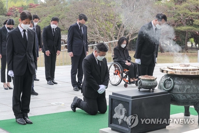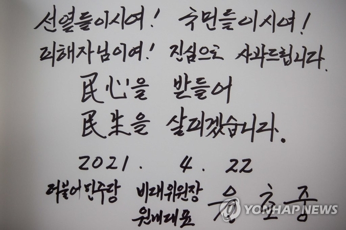 윤 위원장은 이날 새로 구성된 원내지도부와 함께 현충원을 참배하면서 현충탑 앞에 무릎을 꿇었다... 이후 방명록에 ‘선열들이시여! 국민들이시여! 피해자님이여! 진심으로 사과드립니다. 민심을 받들어 민생을 살피겠습니다’라고 적었다...