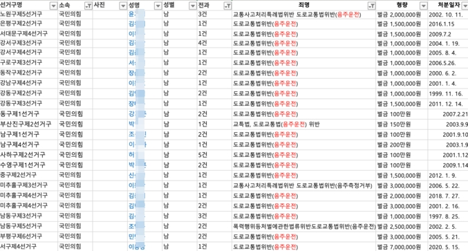 국민의힘의 경우 서울시 강동을의 장태용 시의원 예비후보 역시 음주운전 범죄 이력이 있다. 서울시 강동을 뿐만이 아니다. 전국 예비후보자 중 음주운전 이외의 범죄 이력을 갖고 있는 예비후보자들도 상당수 존재한다.