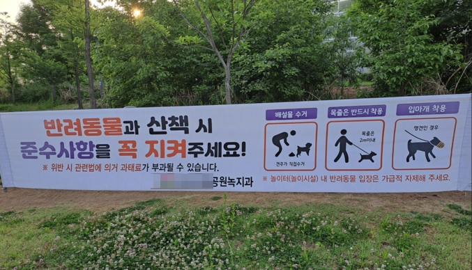 “반려동물과 산책 시 준수사항을 꼭 지켜주세요! 배설물 수거(견주가 직접 수거) / 목줄은 반드시 착용(목줄은 2m 이내) / 입마개 착용(맹견인 경우)” # 사진 참조