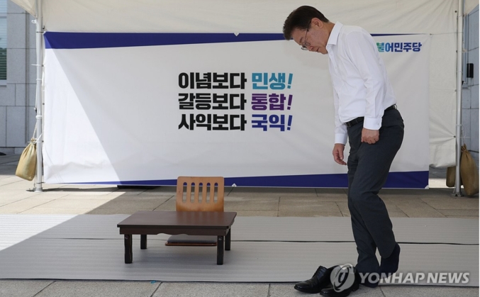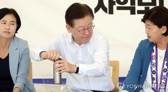 농성은 오전 10시부터 오후 10시까지 진행된다. 나머지 12시간 동안 그는 국회 본청 당 대표실에서 휴식을 취한다는 게 민주당 설명이다... 농성장에 있는 보온병 등도 논란거리다. 이 대표는 이날도 농성장 안에서 책상 위에 놓인 식품 용기를 집어 들고 뭔가를 연신 털어 입에 넣거나, 보온병에 든 액체를 유리잔에 따라 여러 차례 마셨다...