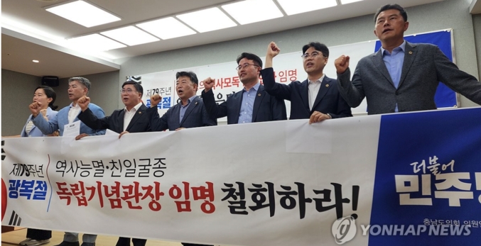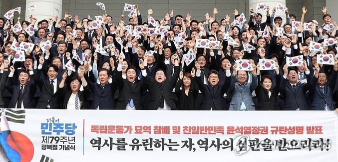 제79주년 광복절 경축식이 15일 정부 공식 행사와 광복회 주최 행사 등 둘로 쪼개져 치러진 가운데, 야당에선 독립기념관장을 국회가 탄핵할 수 있게 하는 법안과 ‘친일’로 지목된 인사의 공직 임용을 금지하는 법안이 나왔다...
