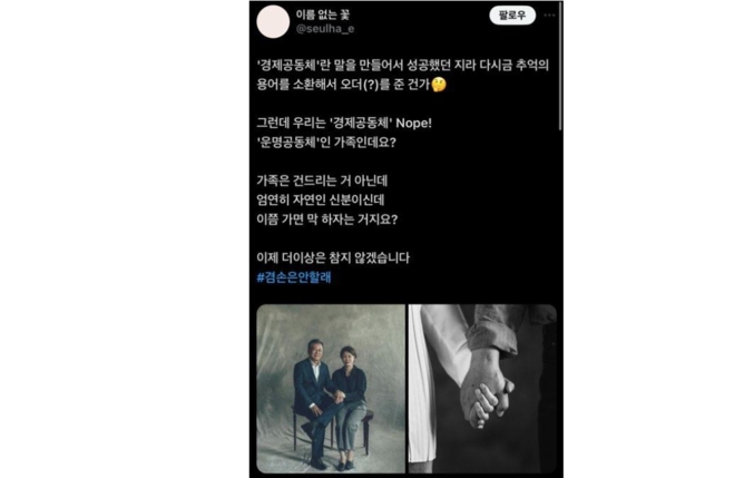 젊은 나이인데 대한민국에서 오래도록 살아가려면 우선 당당함의 자세부터 배워라! 그리고 지나간 4년의 대통령 가족의 특혜 하나로 호화로운 관저에서 살아오는 동안 잘못된 점이 있다면 소신 있게 지적할 것은 지적해야지 아버지 문재인과 운명공동체라고 핑계를 만들지 마라! 정유라의 모친이 아직도 감옥에서 고생하고 있다. 이러함도 경제 공동체가 아니고 운명공동체라면 그대는 받아들일 수 있겠나?