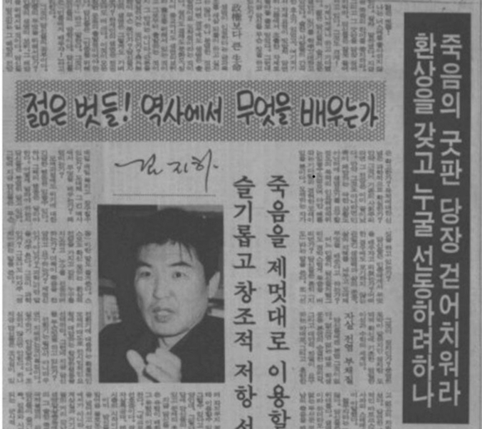 당시 한국 운동권은 소위 ‘주체사상파’로 불리 우는 ‘NL 계’가 장악하고 있었고, 여러 명의 운동권 대학생들이 ‘한반도 영구분단 절대반대’를 외치면서, ‘분신자살’하였다. 이 광경을 목도했던 좌파사상가 김지하 시인은 이들을 향해 ‘죽음의 굿판을 걷어치우라!’고 일갈했었다. 당시 김지하 시인에 쏟아졌던 좌파운동권의 ‘집중포화’로 그는 자발적으로 우경화로 돌아섰고, 그 후 정치와 시민운동을 멀리하고 자연과 향촌에서 여생을 보내고 있다.