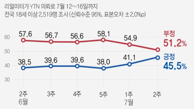리얼미터가 YTN 의뢰로 지난 12~16일 전국 만 18세 이상 2천519명을 대상으로 조사해 19일 발표한 결과, 대통령 국정 수행 지지율(긍정평가)은 전주보다 4.4%포인트 오른 45.5%로 집계됐다. 부정 평가는 3.7%포인트 내려간 51.2%였다...