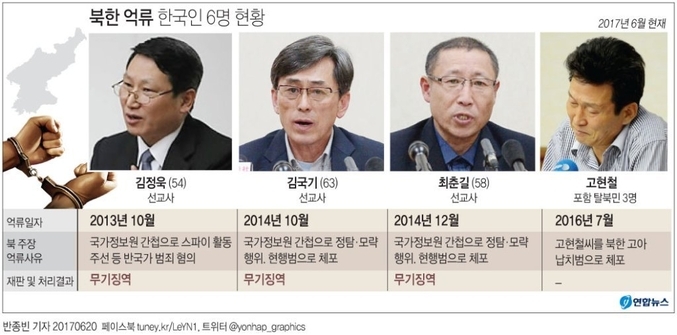 공식적으로 파악되고 있는 북한에 억류된 한국 국민은 모두 6명이다. 지난 2013년에서 2014년 김정욱, 김국기, 최춘길 선교사가 억류됐다. 이와 함께, 한국 국적을 취득한 탈북민 3명이 2016년부터 강제로 억류돼 무기노동교화형을 선고받고 복역 중인 것으로 알려졌다.