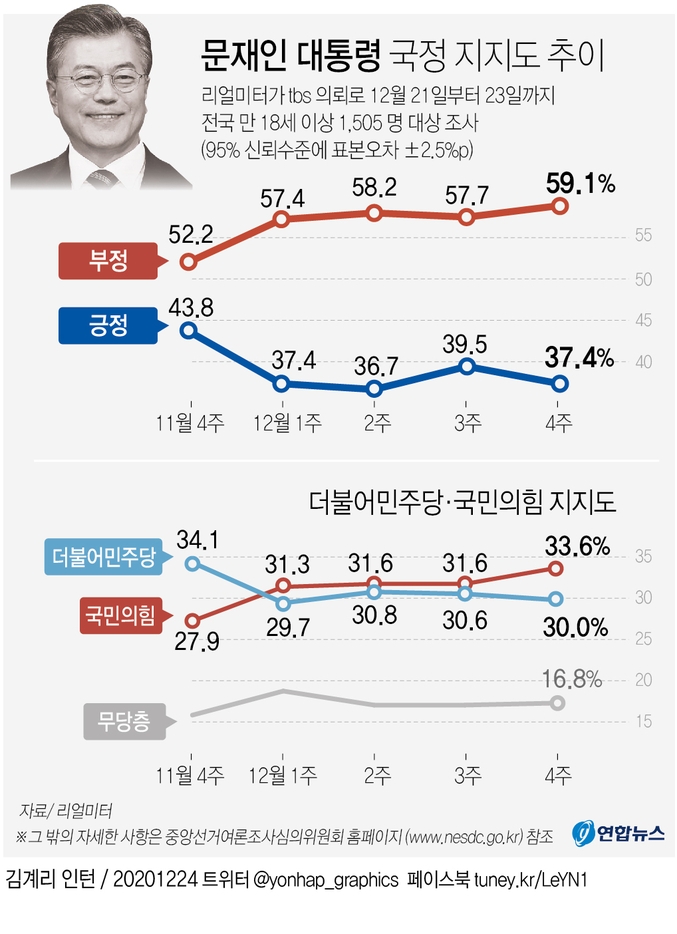 “여론조사 전문회사 ‘리얼미터’가 TBS 의뢰로 지난 21일부터 23일까지 전국 만 18세 이상 1505명을 대상으로 조사해 24일 공개한 12월 4주차 잠정집계 결과, 문 대통령의 국정수행 지지율(긍정평가)은 전주보다 2.1%포인트(p) 떨어진 37.4%로 나타났다...”