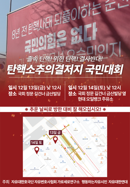 자유대한호국단 등 애국단체들은 13일(금) 오후부터 14일(토) 오후까지 국회의사당 맞은편에서 ‘탄핵소추의결저지 국민대회’를 이어간다.