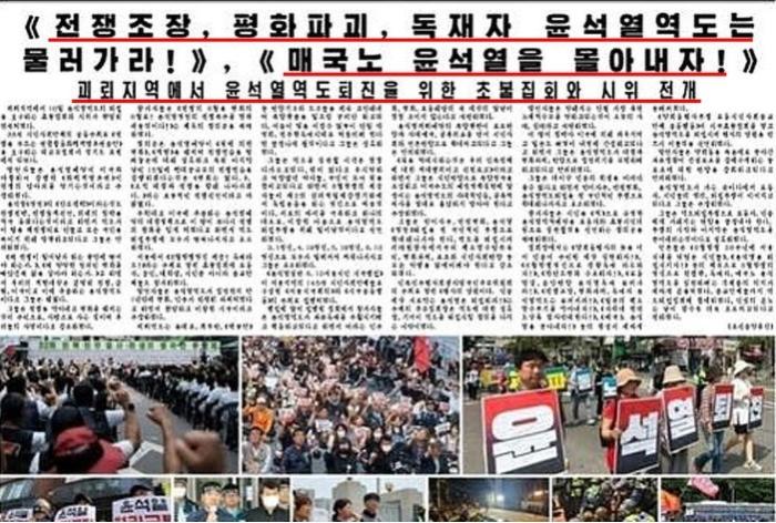 또한 “탄핵안이 무산된 소식에 격노한 100만 이상의 군중은 괴뢰국회와 대통령실 앞에 모여 윤석열과 탄핵을 반대한 국민의힘 의원들을 즉각 탄핵하고 체포할 것을 요구했다. 이에 윤석열은 12일 거짓 담화를 발표했으나, 이는 오히려 비상계엄망동의 책임을 야당과 외부의 위협으로 떠넘기는 시도로 비판받았다.”고 보도했다.