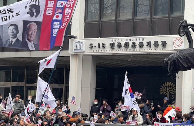 광주 금남로의 518기념관과 이승만 건국 대통령 깃발