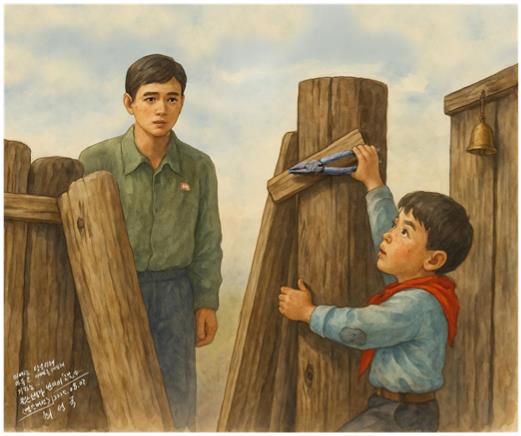 아빠는 국가를 위해 충성하고 아들은 아빠를 대신해 울타리를 고치고 있다.