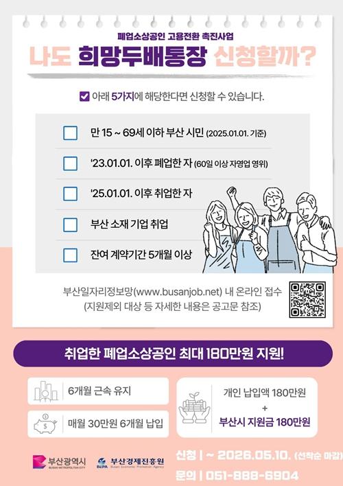 2023년 이후 폐업한 부산 거주 소상공인이 2025년 이후 부산 소재 기업에 취업하면 신청할 수 있으며, 참여자가 월 30만 원씩 최대 6개월간 적립하면 동일 금액을 시비로 추가 지원하는 방식이다.
