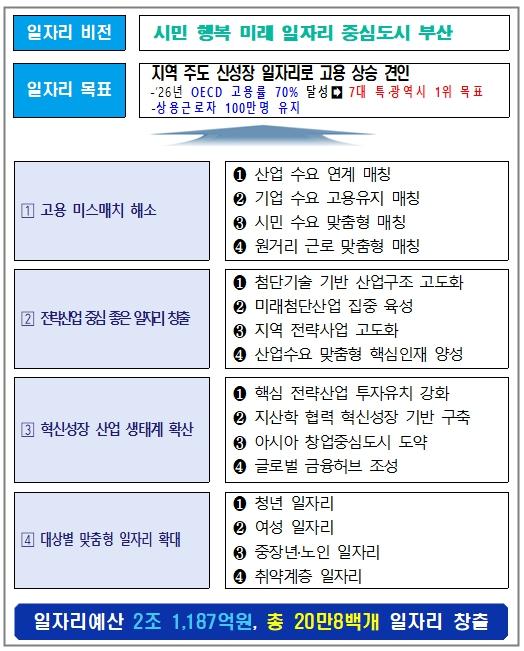 종합계획은 '시민행복 미래 일자리 중심도시 부산'을 비전으로 ▲고용 미스매치 해소 ▲전략산업 중심 좋은 일자리 창출 ▲혁신성장 산업 생태계 확산 ▲대상별 맞춤형 일자리 확대의 4대 전략 16개 실천 과제로 구성됐다.