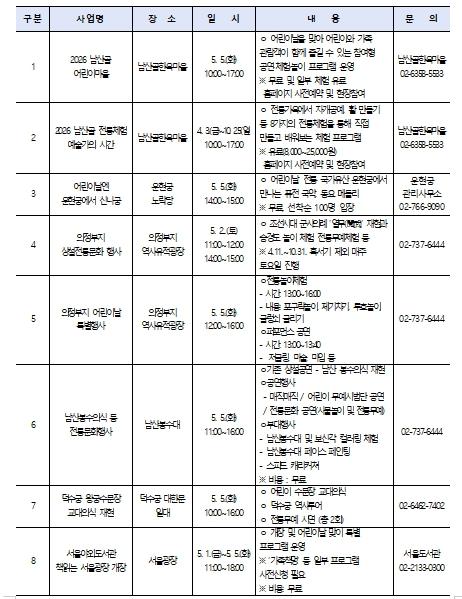 서울역사박물관 어린이박물관에서는 '한양에서 놀자!'(5.5.) 행사를 통해 공방·체험 프로그램 등이 진행되며, 경희궁에서는 독서 프로그램 '책 읽으라궁' (5.5., 5.10.)이 진행된다. 어린이 대상의 체험형 기획전시도 운영되고 있다.
